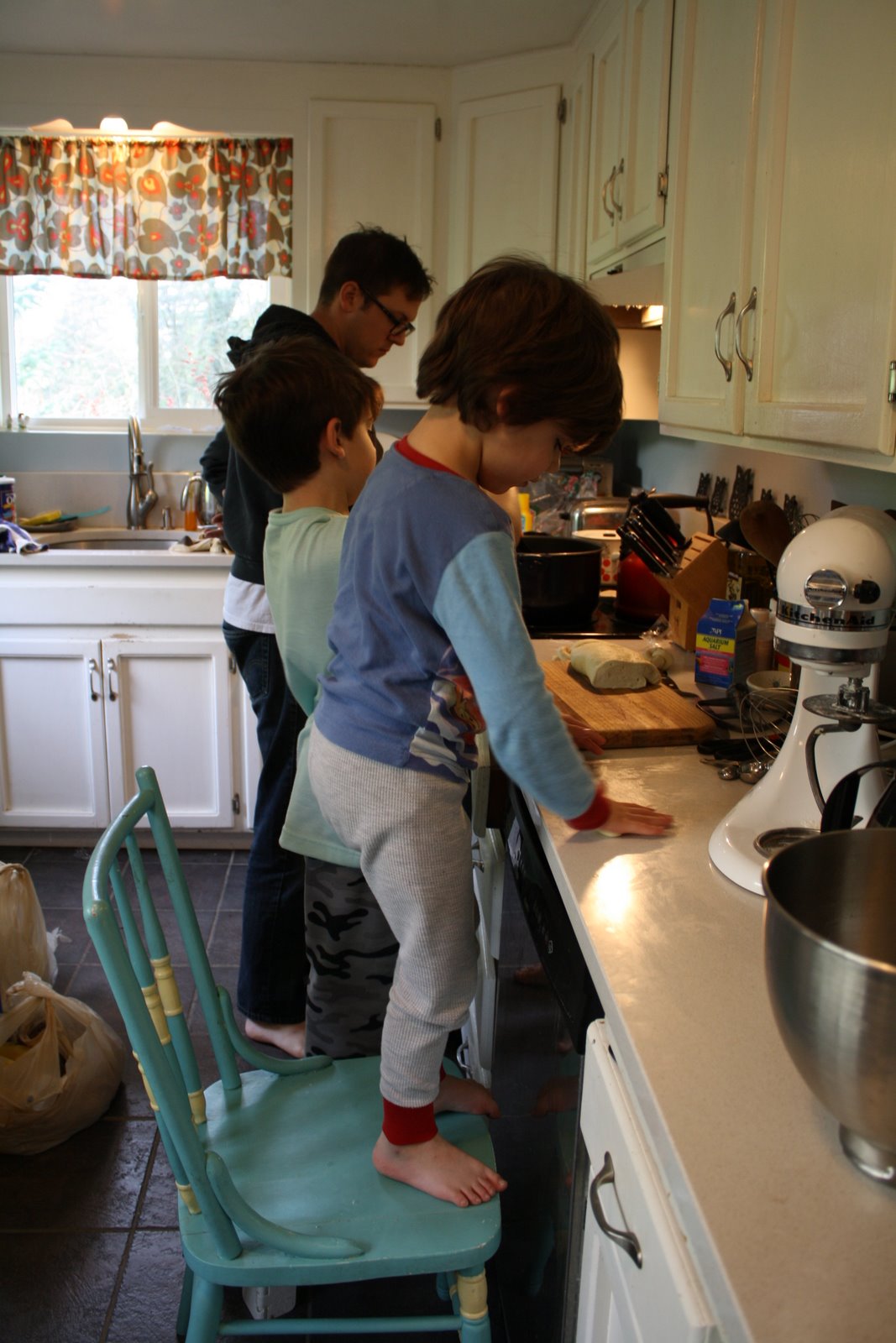Gus put his new knives to work, cutting biscuits for Monkey Bread: